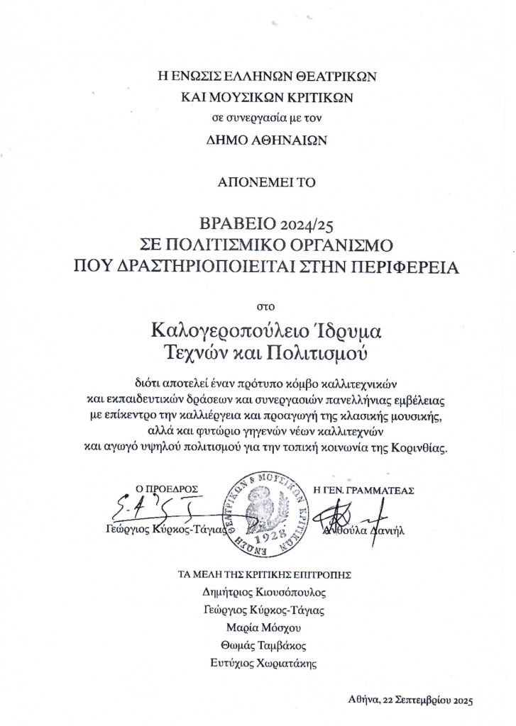 𝜝𝝆𝜶𝜷𝜺𝜾́𝝄 𝝈𝜺 𝜫𝝄𝝀𝜾𝝉𝜾𝝈𝝁𝜾𝜿𝝄́ 𝜪𝝆𝜸𝜶𝝂𝜾𝝈𝝁𝝄́ 𝝉𝜼ς 𝜫𝜺𝝆𝜾𝝋𝜺́𝝆𝜺𝜾𝜶ς: 𝜥𝜶𝝀𝝄𝜸𝜺𝝆𝝄𝝅𝝄𝝊́𝝀𝜺𝜾𝝄 𝜤́𝜹𝝆𝝊𝝁𝜶 𝜯𝜺𝝌𝝂𝝎́𝝂 𝜿𝜶𝜾 𝜫𝝄𝝀𝜾𝝉𝜾𝝈𝝁𝝄𝝊́ (𝜥𝝄́𝝆𝜾𝝂𝜽𝝄ς)Μεγάλη χαρά και τιμή για το Καλογεροπούλειο Ίδρυμα Τεχνών και Πολιτισμού που βραβεύτηκε για την προσφορά του στο Πολιτισμό και ξεχώρισε απ΄ όλη την ελληνική περιφέρεια.Ευχαριστούμε την Ένωση κριτικών θεάτρου και μουσικής για την αναγνώριση της 10 ετούς πορείας μας.https://www.cityofathens.gr/140824/