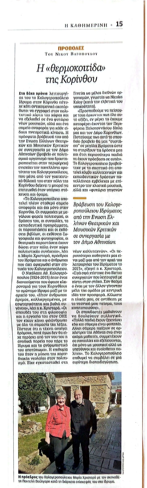 Το Καλογεροπούλειο Ίδρυμα Τεχνών και Πολιτισμού ευχαριστεί τον δημοσιογράφο κ. Νίκο Βατόπουλο (Nikos Vatopoulos) για την ουσιαστική και διεισδυτική παρουσίαση της πορείας και της αποστολής του Ιδρύματος, καθώς και την εφημερίδα Η Καθημερινή για τη φιλοξενία και τον χώρο που αφιερώνει σε πολιτιστικές δράσεις της περιφέρειας.